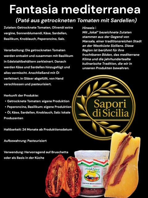 Zutaten: Getrocknete Tomaten, Natives Olivenöl Extra, Sonnenblumenöl, Käse, Sardellen, Basilikum, Knoblauch, Chili, Salz.